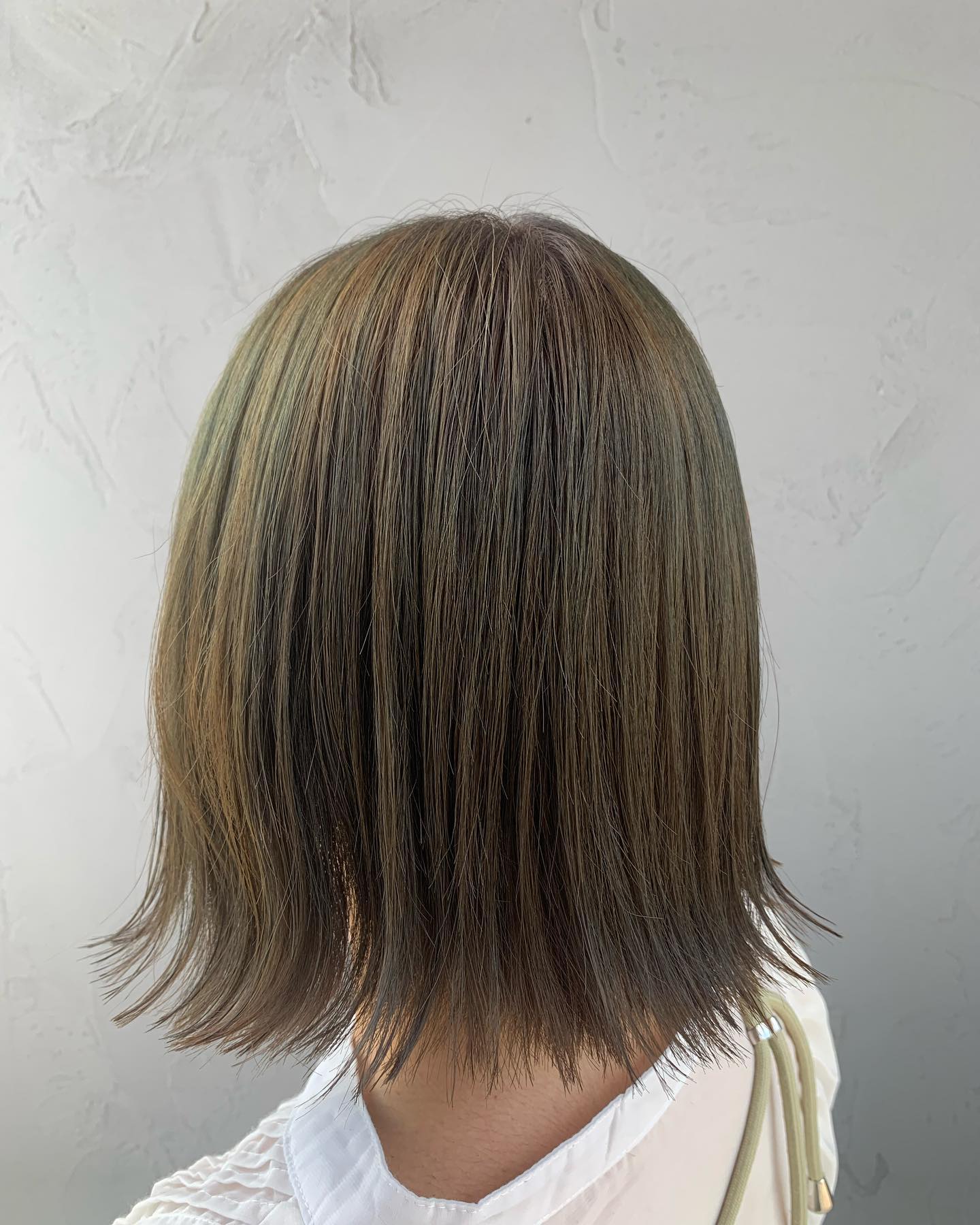 マットベージュ🫒オリーブカラー by MIYUKI 古河美容室 RETO 切りっぱなしボブ ルフレカラー ターコイズカラー マットベージュ ブリーチなしカラー オリーブカラー